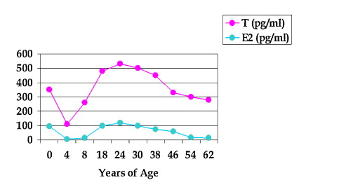 Throughout the female lifespan, testosterone (T) is the most abundant active steroid. T levels are significantly higher than estradiol (E2) levels.